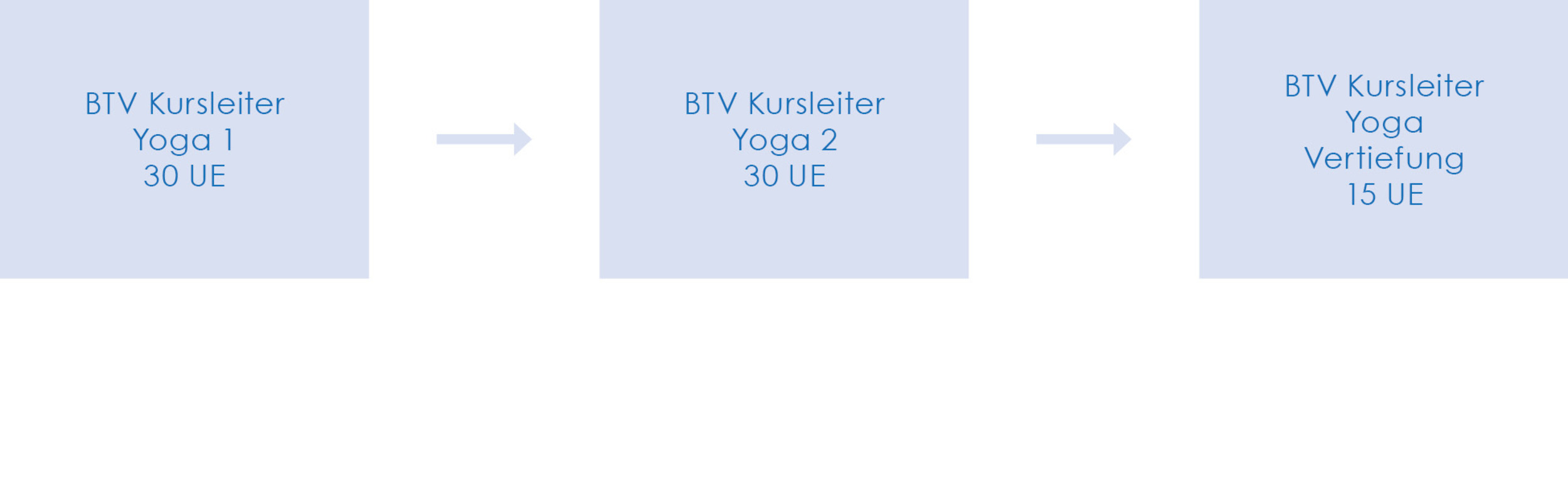 Neu: Das Zertifikat „BTV-Kursleiter Yoga“ erhältst du nach Absolvieren des BTV-Kursleiter Yoga 1 (30 UE). Hier lernst du die Basics kennen. Du hast die Wahl, ob diese erstmal ausreichend für dich und deine Kursstunden sind oder du im Anschluss durch die Teilnahme am BTV-Kursleiter Yoga 2 (30 UE) die gelernten Grundlagen weiter ausbauen und evtl. durch den Lehrgang BTV-Kursleiter Yoga Vertiefung (15 UE) intensivieren möchtest.